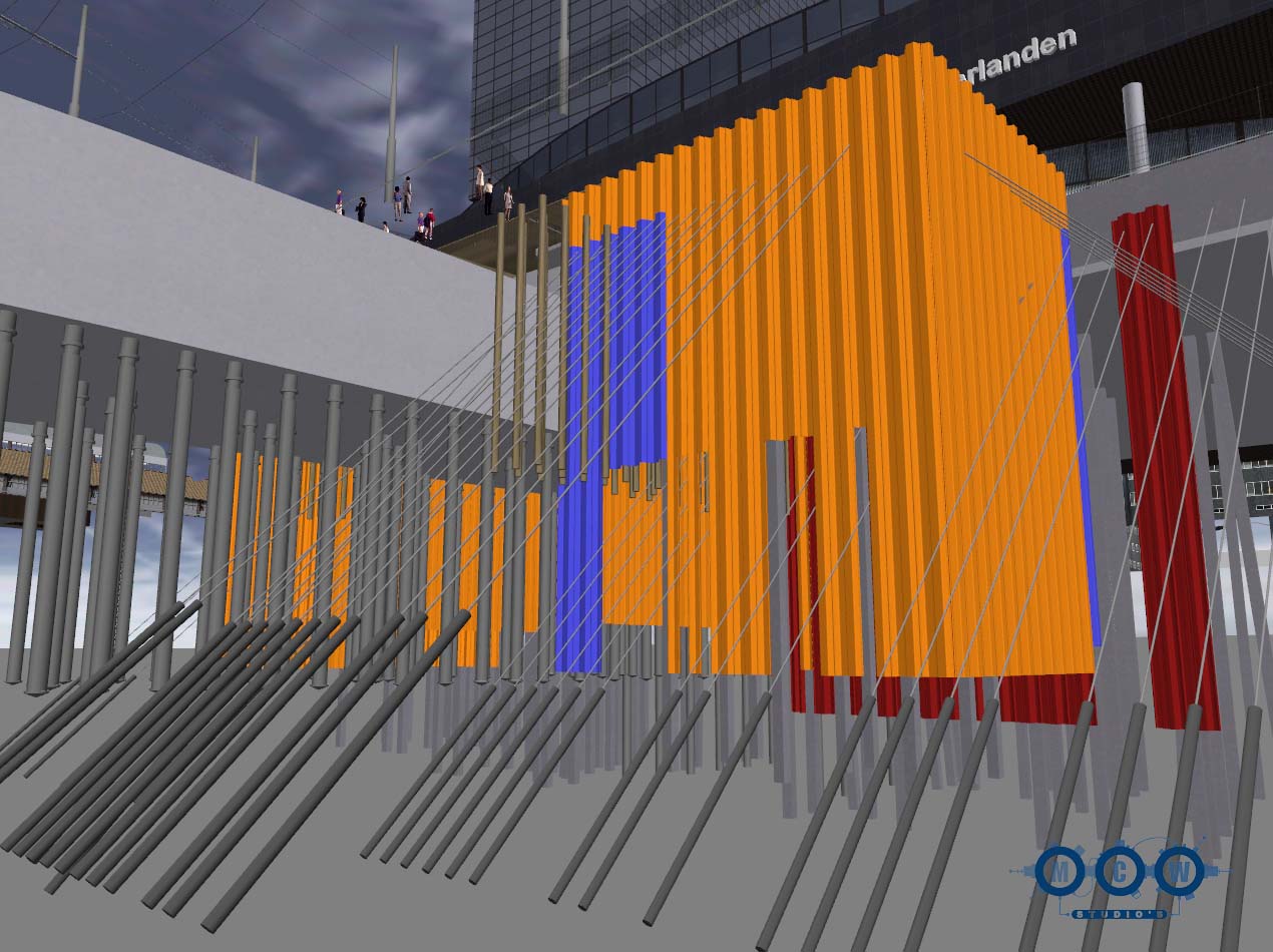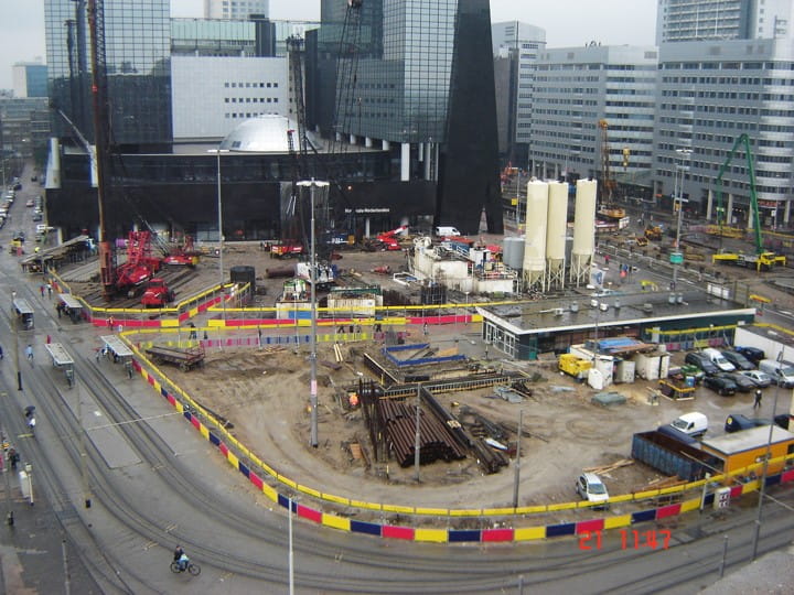 Die U-Bahn-Haltestelle „Centraal Station“ liegt unterhalb des Busbahnhofs, unmittelbar vor dem Hauptbahnhof und dem Hochhaus der „Nationale Nederlanden" Bank – ein klassischer Fall von beengten innerstädtischen Bauverhältnissen. Die Erweiterungsarbeiten an der U-Bahn-Station sollten bei durchgängig laufendem Verkehr innerhalb einer über 15 m tiefen Baugrube stattfinden. Bei der Planung der wasserdichten Baugrubenumschließung mittels Schlitzwänden war nicht nur vorhandener Altverbau aus früheren Baumaßnahmen im Untergrund zu berücksichtigen, als besondere planerische Herausforderung sollte der bestehende Tunnel auch die östliche Baugrubenwand durchstoßen.