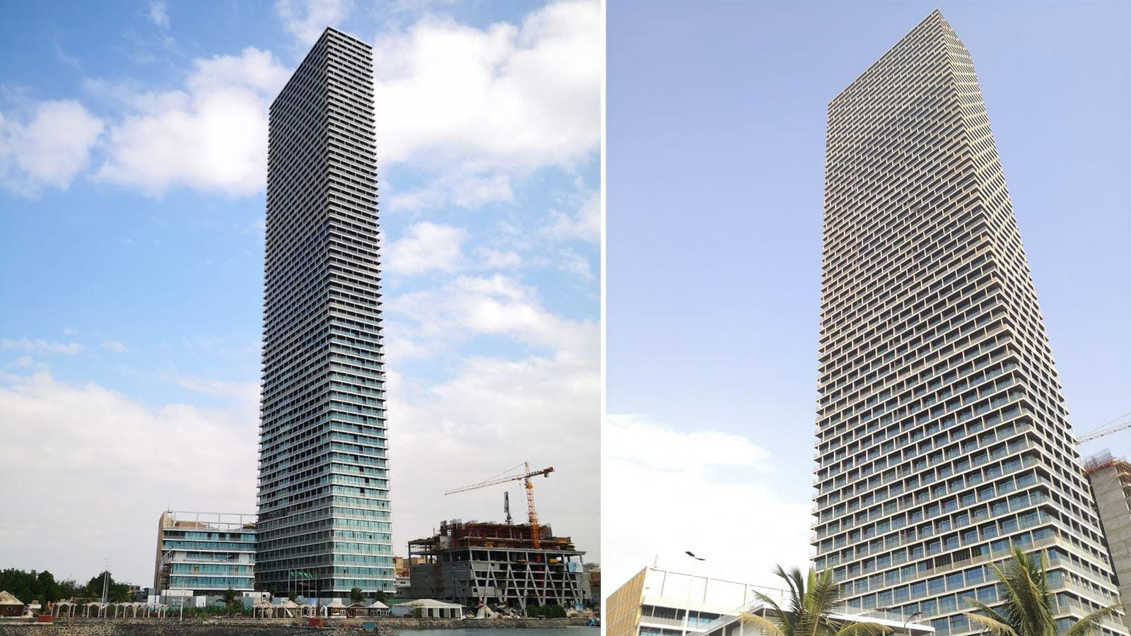 The high-rise rests on a 3 m reinforced concrete slab built on 125 foundation piles at a depth of 50 m. The excavation pit to accommodate the basement floors enclosed single-layer tied-back anchored diaphragm wall measuring 400 m in length and 20 m in depth; a deep injection well at a planned thickness of 4 m was used to reduce groundwater intrusion, and thirty deep wells were installed to drain the construction pit and remaining water. Around 1,800 m³/h of groundwater was extracted and drained to the Red Sea via two underground DN800 pipes on lowering the water table to the required depth.